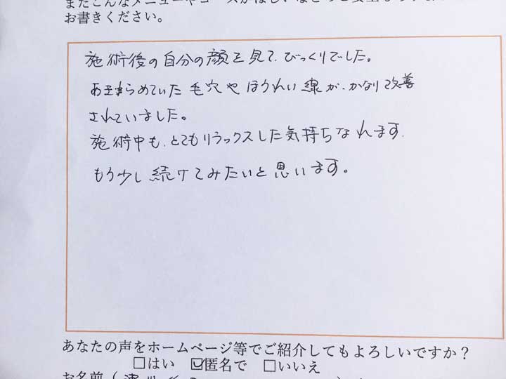 「施術後の自分の顔を見てびっくりでした。あきらめていた毛穴やほうれい線が、かなり改善されていました。施術中もとてもリラックスした気持ちになれます。もう少し続けてみたいと思います」