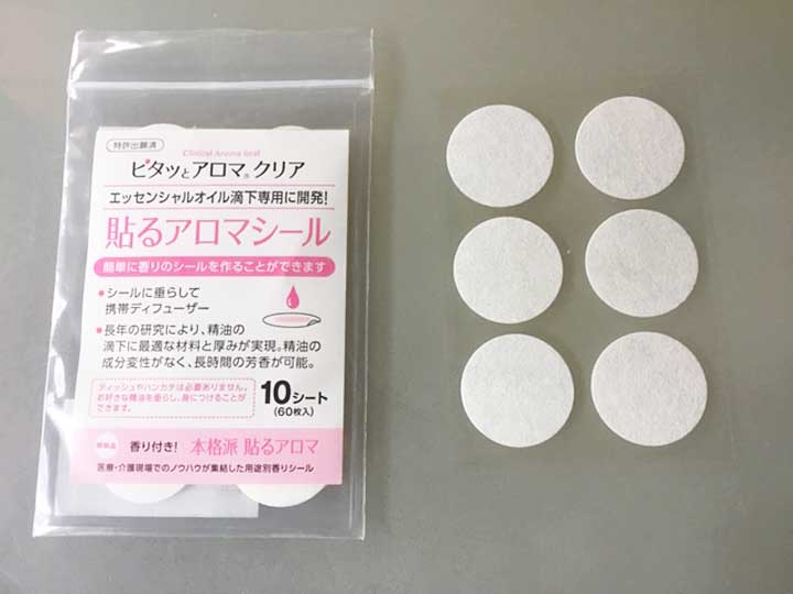 このシールに精油を1~2滴たらしてマスクに貼ります。もったいないので一枚を4等分して使っています。