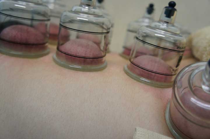 よくスポーツ選手などの身体に紫色のあざがついていたりしますが、あれが吸い玉のあとです。古くからある民間療法で真空状態のガラスやプラスチックカップをコリの気になる部分に吸着させます。