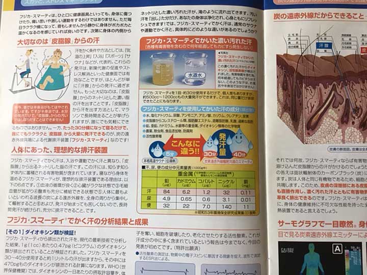 30キロ近いマラソンなどの運動をしないと出ない皮脂腺からの汗をかくことにより、コレステロール、乳酸、化学物質(水銀、カドミウム、鉛など)排出できます。