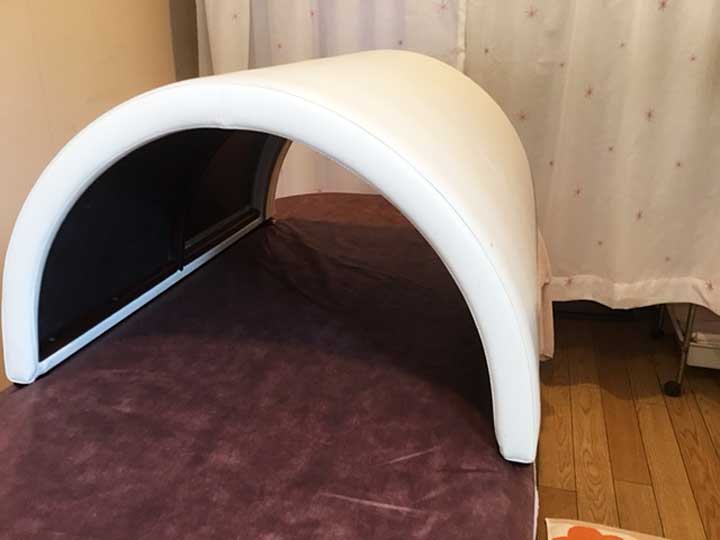 下の写真は上半身用のドームサウナでトンネルになっているので上半身を施術しているときは下半身にこのドームを置き下半身施術しているときは上半身にドームを置き温めながら施術しています。熱が逃げないようにバスタオルでドームを覆っています。これでもけっこう温まります。