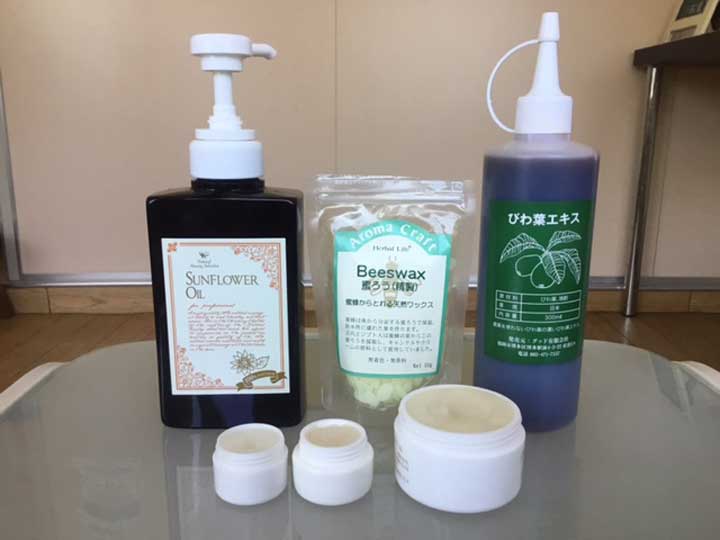 お顔用クリーム、ハンドクリーム、かかと用クリームなど お悩みに合わせたクリームを精油を使って好きな香りで、お好みでひまし油、ビワエキスなど入れてクリームを作ります。一度覚えるとご自分でも簡単に作ることができます。