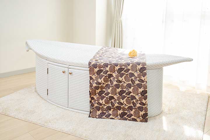 「葉マム」は葉っぱの形をしたベッドの上に横になり、下から蒸気をあてて、全身にハーブのエキスを浴びることができる温熱療法
