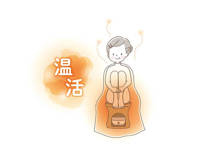 イラストのように乾燥したよもぎを煮出して その蒸気を下半身からあて マントで蒸気が逃げないように覆って全身を温めます。特に生理痛や更年期障害などの婦人科系の不調に効果があり、汗の量もすごいくてデトックス効果が高いです。