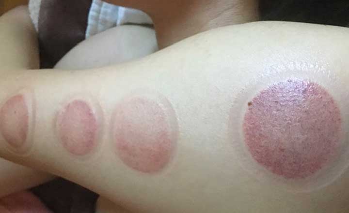 腕の痛みがあるお客様にカッピングをしました。2分ほどカップをつけただけで色がすぐ出ました。