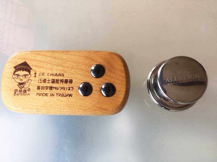 どちらも磁気付きで右側の丸いほうはかなり強力な磁気マッサージ器
